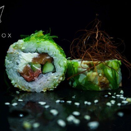 рис, нори, филе тунца, филе лосося, сливочный сыр, зелёный лук, огурец
