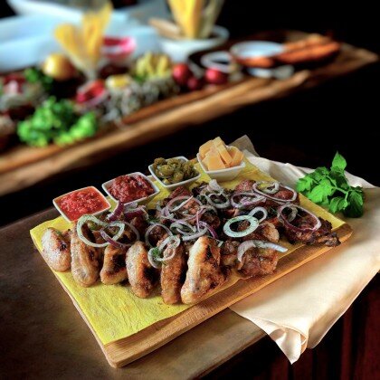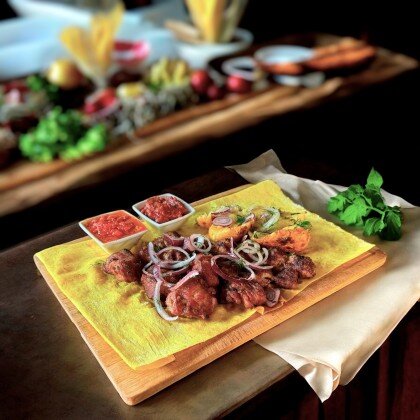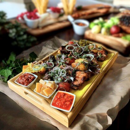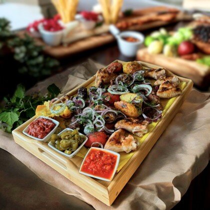 куриные крылья (300), рёбрышки (300), картофель гриль (300), маринованный огурец (100), аджика (70), фирменный соус (140), перец халапеньо (30), лаваш (200)
