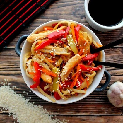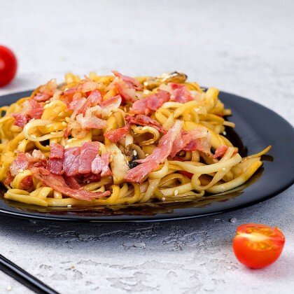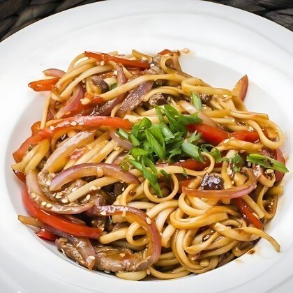 Лапша Удон, сливки, чеснок, шампиньоны, сладкий перец, сельдерей, соль, перец, сыр пармезан, тигровые креветки