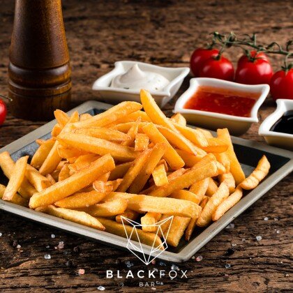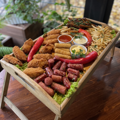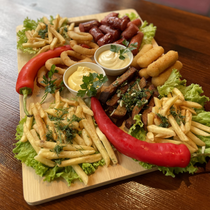 куриные наггетсы, сырные палочки, картофельные дольки, чесночные гренки, солёный огурец, соус Цезарь (чесночный), сладкий соус чили