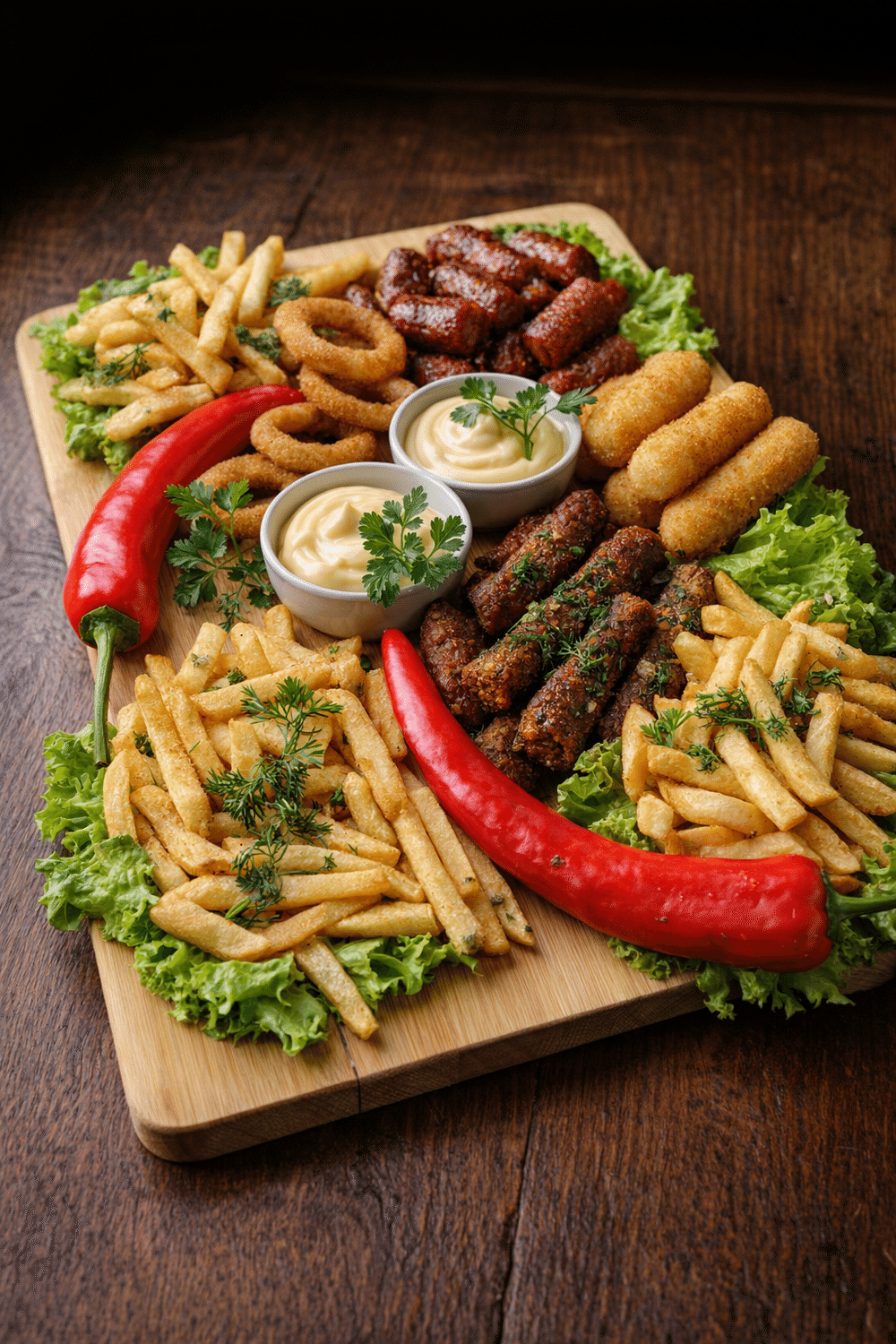 охотничьи колбаски, сырные палочки, картофель фри, луковые кольца, чесночные гренки, соус Цезарь (чесночный), сырный соус